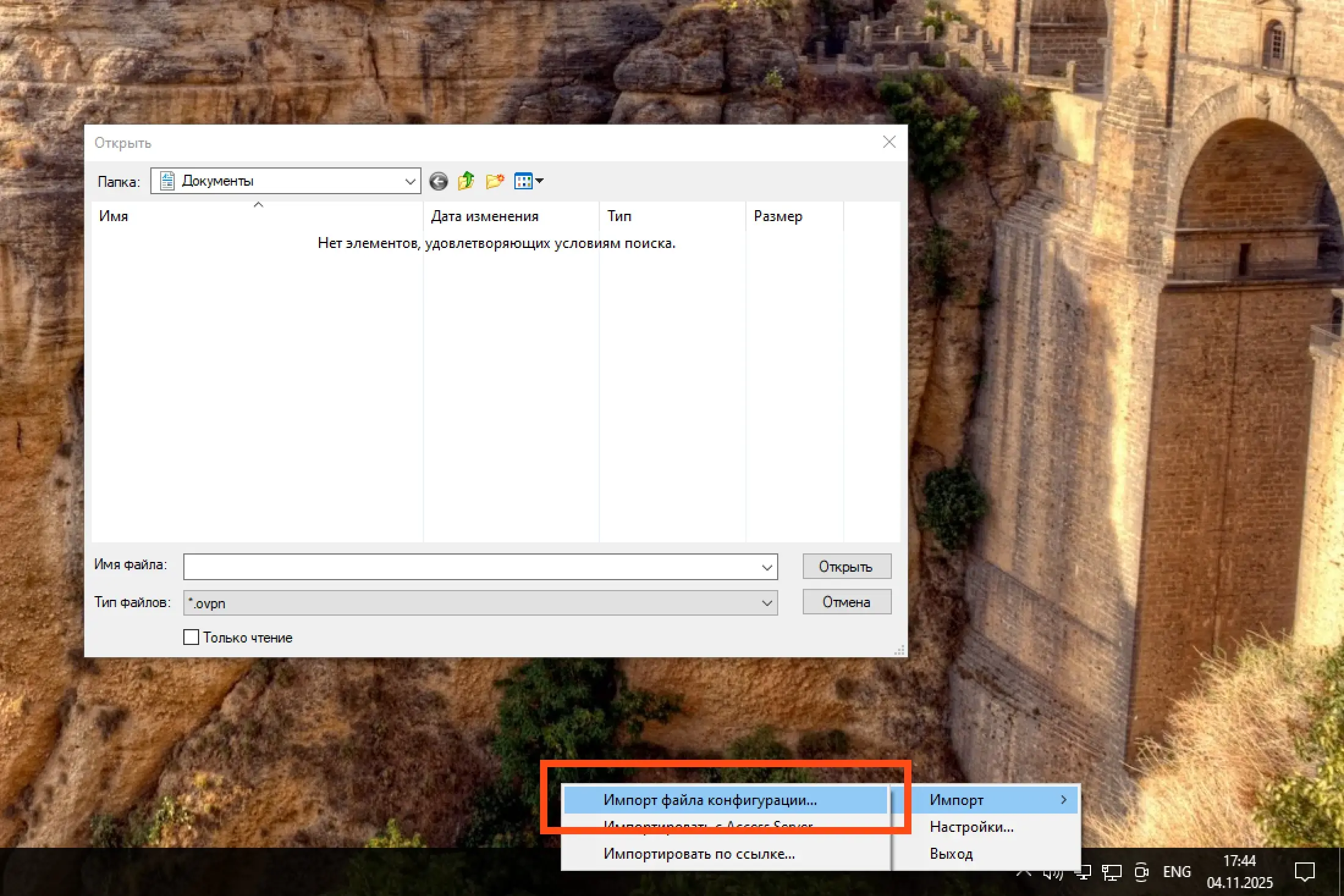 Открыть меню управления OpenVPN GUI можно, нажав на значок программы правой кнопкой мыши. Для установки конфигурационного файла необходимо выбрать пункт «Импорт файла конфигурации…» и открыть предоставленный файл с расширением «.ovpn».